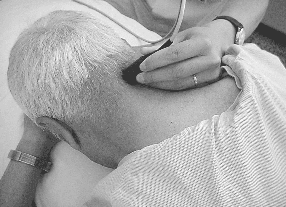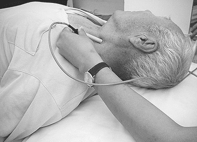 位于枕部的骨性標志枕骨粗隆下方,發(fā)際上1cm左右,探頭置于枕窗中央部朝向枕骨大孔或置于兩旁(枕旁窗)。經(jīng)枕窗檢測時受檢者一般取坐位,頭頸部放松稍向前屈,下頜略向胸部抵近。病情危重或行動不便者也可采用側臥位,同樣將下頜抵向胸前,保持頭頸部的前屈位置。通過枕窗及枕旁窗可以檢測雙側椎動脈(VA)和基底動脈(BA),也能檢測小腦后下動脈(PICA),但不夠恒定.