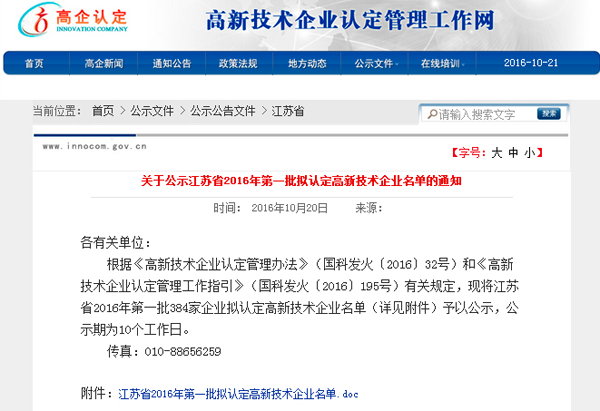 20161021日,江蘇省2016年度首批認(rèn)定的高新技術(shù)企業(yè)名單公布(見附件309號(hào)),包括南京科進(jìn)實(shí)業(yè)有限公司在內(nèi)的384家企業(yè)榜上有名。