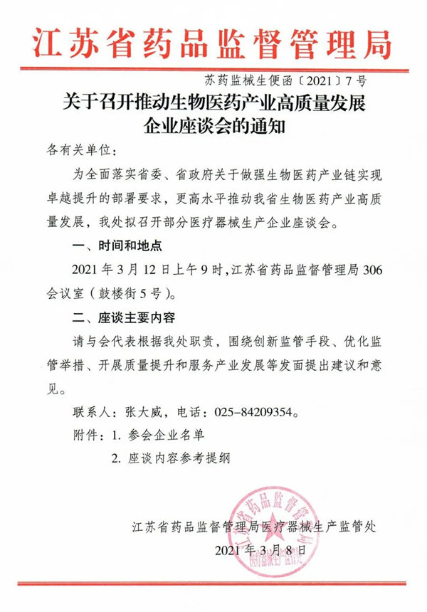 3月12日上午,公司領(lǐng)導(dǎo)應(yīng)邀參加江蘇省藥品監(jiān)督管理局組織的“推動生物醫(yī)藥產(chǎn)業(yè)高質(zhì)量發(fā)展企業(yè)座談會”。參加會議的有江蘇魚躍、南微醫(yī)學(xué)、諾唯贊等十家省內(nèi)知名企業(yè)。江蘇省藥監(jiān)局陳和平副局長,醫(yī)療器械生產(chǎn)監(jiān)管處和稽查處的有關(guān)同志參加,監(jiān)管處張興華處長主持。