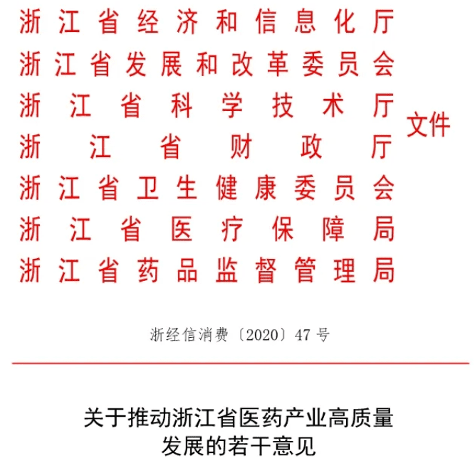 近日,浙江省發(fā)展改革委、省經(jīng)信廳、省科技廳、省財(cái)政廳、省衛(wèi)生健康委、省醫(yī)保局、省藥監(jiān)局共同印發(fā)《關(guān)于推動(dòng)浙江省醫(yī)藥產(chǎn)業(yè)高質(zhì)量發(fā)展的若干意見(jiàn)》(下稱《意見(jiàn)》)。